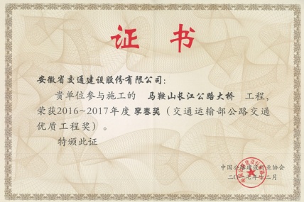 7月31日,全國公路行業(yè)高峰論壇頒發(fā)2016-2017年度全國公路優(yōu)質(zhì)工程獎——李春獎——由安徽交通建設股份有限公司承建的馬鞍山長江公路大橋、安徽省六安至岳西至...