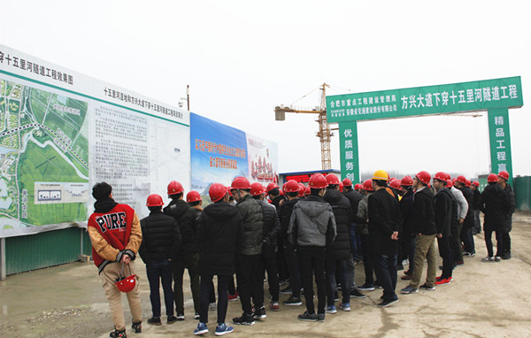 3月8日下午,十五里河濕地工程和方興大道下穿十五里河隧道工程項(xiàng)目(以下簡(jiǎn)稱方興大道項(xiàng)目)迎來了安徽理工大學(xué)土木工程專業(yè)參觀團(tuán),近百名學(xué)子在項(xiàng)目駐地及施工現(xiàn)場(chǎng)進(jìn)行了系統(tǒng)的學(xué)習(xí)、交流。